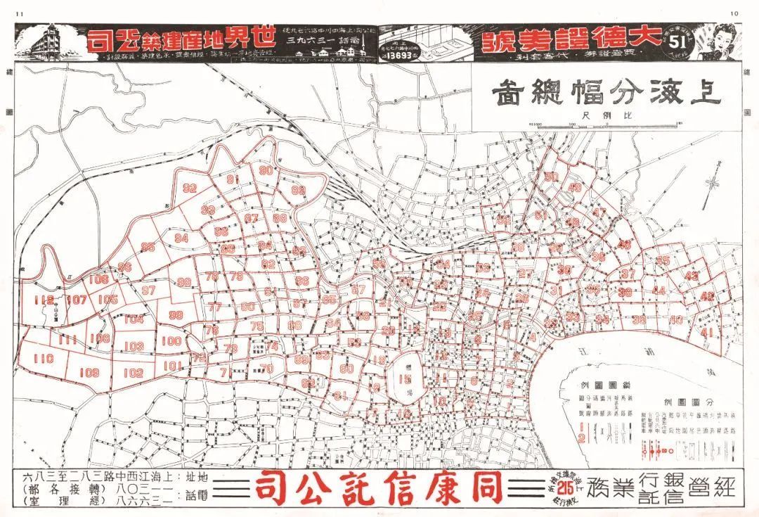 《上海市行号路图录》(下册)从1947年冬天开始编制,历时18个月方始完成,于1949年3月杀青,共有118幅路图和9座大楼图。与第一辑相同,每幅路图后面仍然插入全版的广告页。下册根据1940年的《上海市行号路图录》版本,范围有所扩大,新增老城厢、南市和法华地区的路图,所覆盖地区的街道路网较为复杂,道路曲折多变,而且路名也在变更过程中,测绘和调查都比较困难。尽管如此,我们从下册的118幅路图中并不会感到图面质量的问题。
