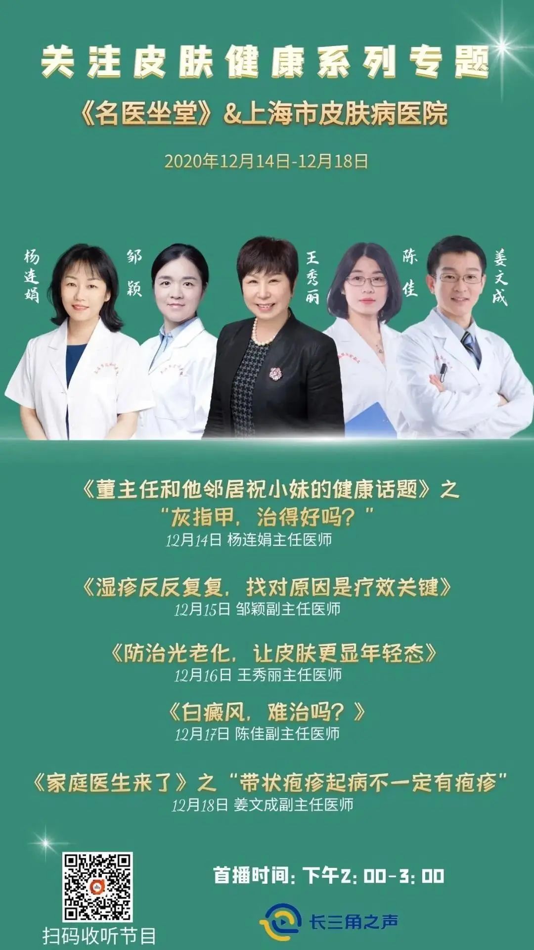 好消息!从12月14日到18日每日下午14:00~15:00,上海市皮肤病医院多位专家做客长三角之声的《名医坐堂》,在线答疑,免费为大家解答灰指甲、湿疹、皮肤老化等常见的皮肤问题。