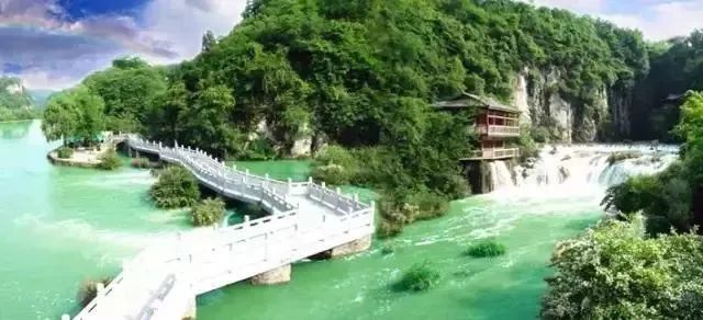 天河潭风景区位于贵阳市花溪区石板镇境内,景区内有宽210米的钙化滩瀑布;龙潭洞内则有石钟乳、石笋、石柱等喀斯特景观。景区附近还能看到民族村寨的石板建筑,颇有农家风情。