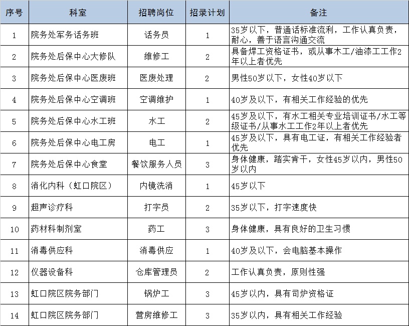 报名即日开始,招满为止。涉及住院医师规范化培训人员、合同制专业技术人员(含医疗、医技、药剂、研究、工程、财会、管理等多个专业系列)和合同制工人,具体岗位如下:
