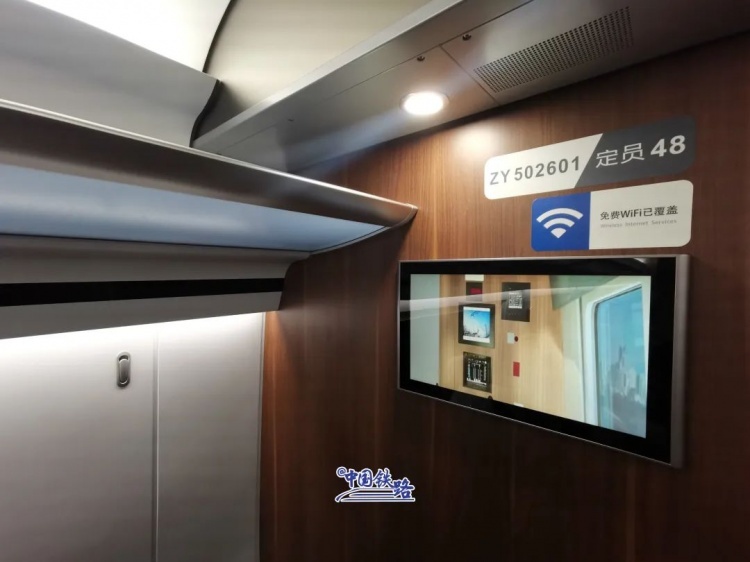 每节车厢内设置了4个温度传感器,智能空调系统让车内温度更适宜。行李架过道边缘增加250个座位显示器,方便旅客查找核对本人座席。