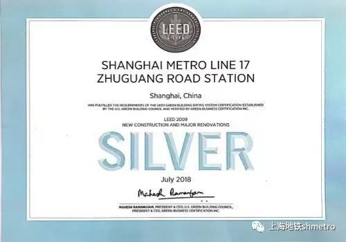 2018年,轨道交通17号线诸光路站成为亚洲第一个获得LEED(Leadership in Energy and Environmental Design)银级认证的地铁车站。