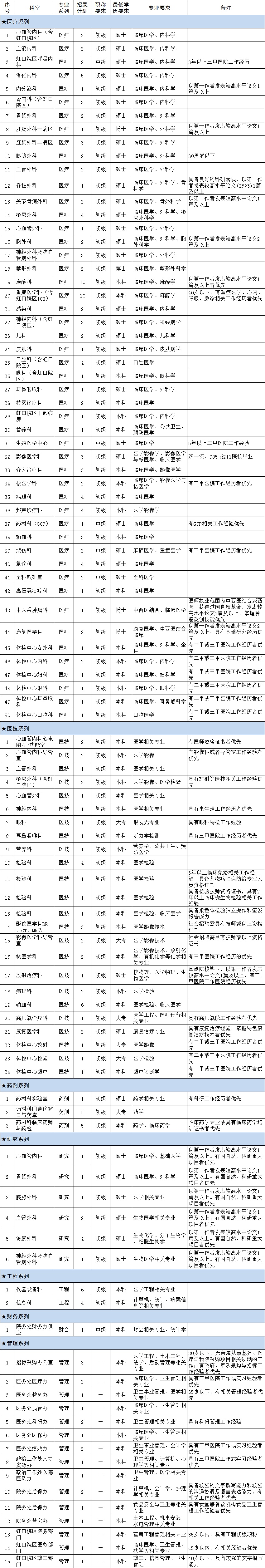 报名即日开始,招满为止。涉及住院医师规范化培训人员、合同制专业技术人员(含医疗、医技、药剂、研究、工程、财会、管理等多个专业系列)和合同制工人,具体岗位如下: