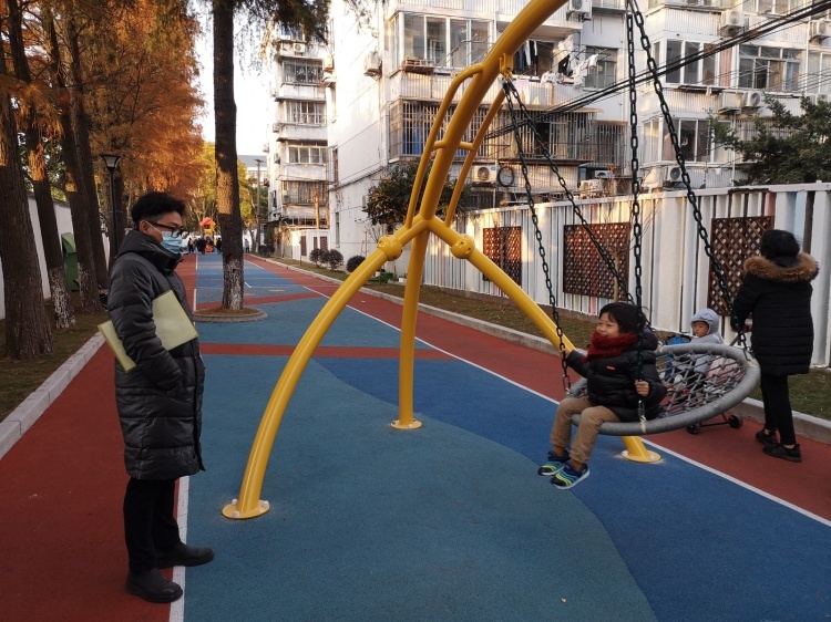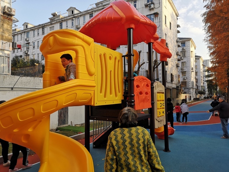 下午4点左右,在上钢德州三村小区尽头,不时传出孩子们的欢声笑语。此时,幼儿园刚放学,在这处名为百步园的休闲场地里,跷跷板、滑滑梯、荡秋千等成了小朋友们爱不释手的“伙伴”,而不少老人则三三两两在步道上散步,还不时聊上两句。在冬日的夕阳下,这里成了老少皆宜的活动场所。