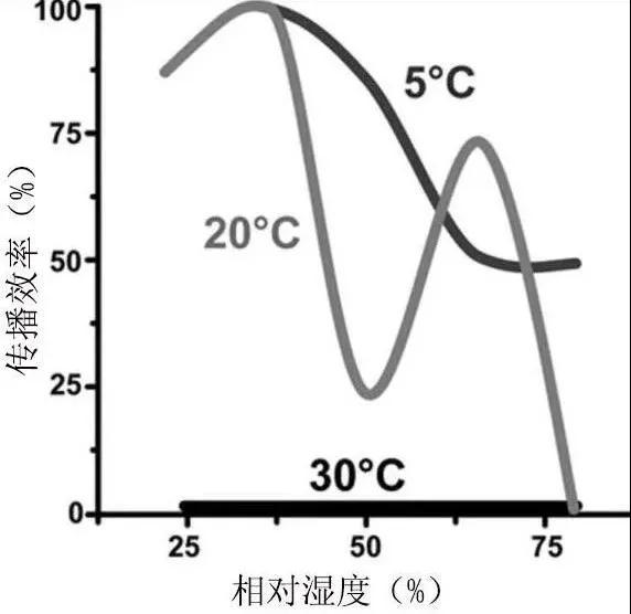 除了温度以外,湿度也是影响呼吸道传染病传播效率的重要因素。有学者在动物模型中模拟了流感病毒在人群中的传播,发现在室温条件下(20℃左右),随着相对湿度的变化,病毒的传播效率波动很大。
