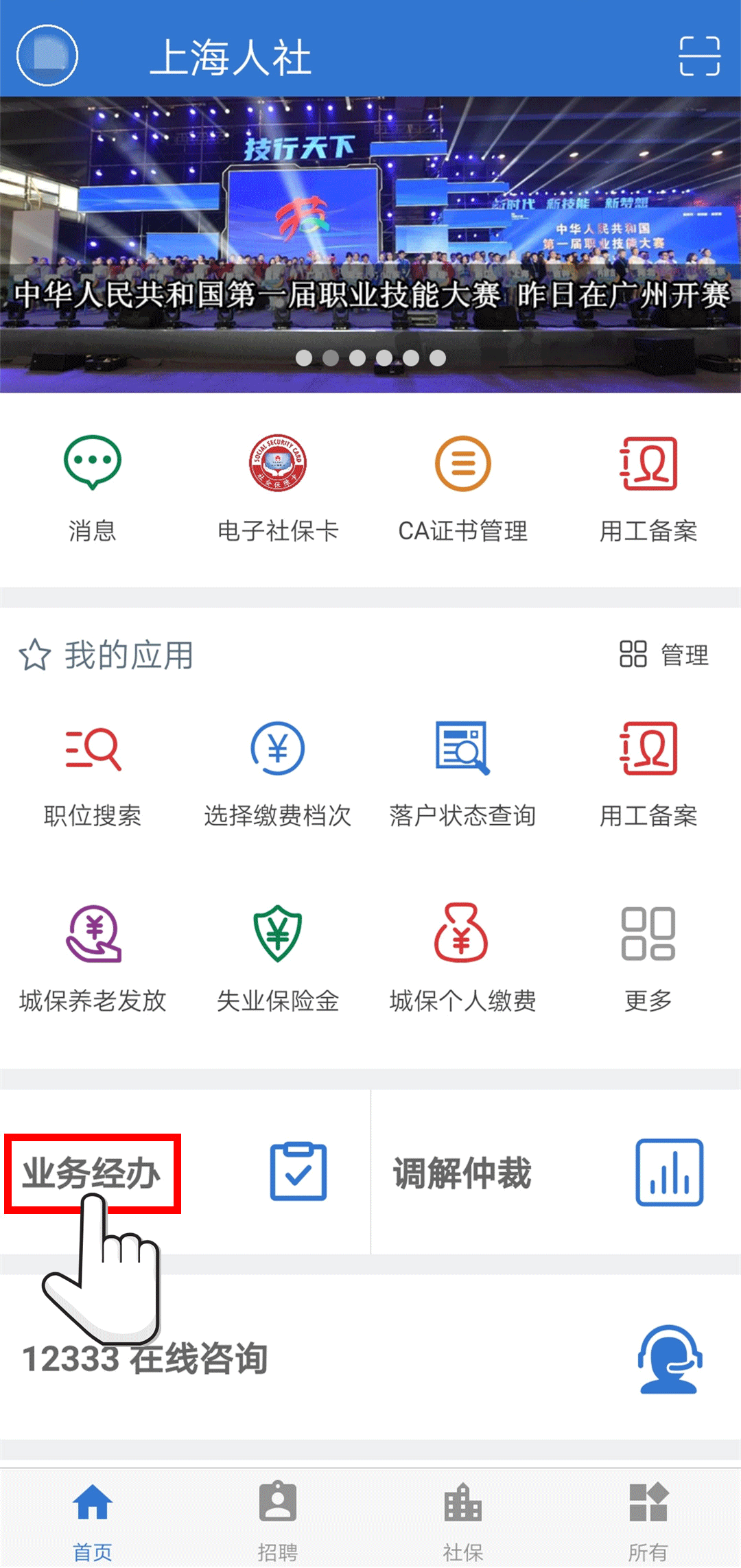 首先打开“上海人社”APP,进入首页,完成用户登录,依次点击“业务经办”—“社会保险”—“城保缴费查询”—“养老保险缴费情况查询”栏目。