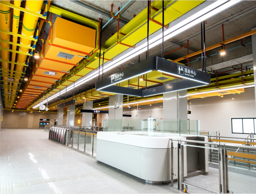 车站公共区全部采用无吊顶设计,整个公共区空间在视觉上更为高大宽敞和通透,减少地下空间的压抑感,带给乘客更愉悦舒适的地下空间体验。通过特别设计的综合支架联接件以及色彩的搭配,使管线及支架本身更具视觉性,形成更趋个性化的装饰语言,体现地铁特有的结构美感。墙面及立柱的装饰大块面板材,使得墙、柱在视觉上更显空间的景深和通视效果。入口处等乘客场景明显变换区域采用木纹面装饰板,彰显温度之城、温度地铁的一份暖意。