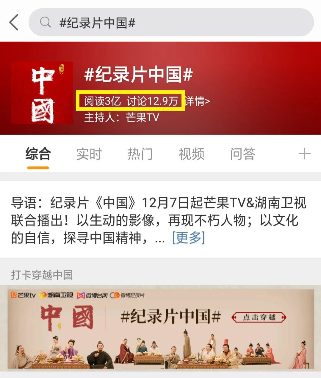 近日,纪录片《中国》播出后频繁登上热搜,节目播出首日微博话题#纪录片中国#阅读量高达2.3亿!关联话题四次登上热搜。
