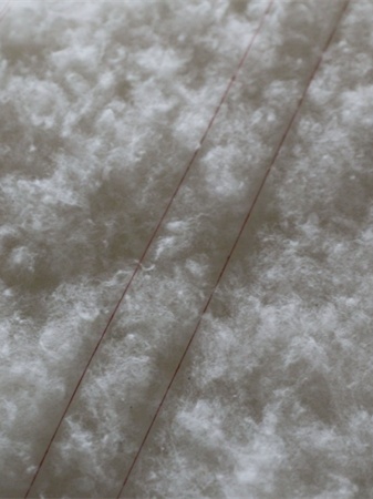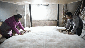 奚师傅边说着,边与老伴相互配合,只见他们将松软的棉花平铺,交叉叠放,掌握好每个区域的尺寸、薄厚程度,再覆上一层薄纱、压实,一床棉花被便初具雏形。