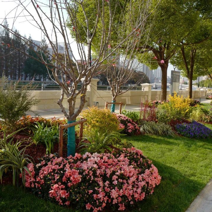 宝丽嘉酒店(原第一人民医院)区域有开阔的景观视野,酒店的氛围与外部空间仿佛是时光曲的契合,设计目标是成为每个市民与游客休憩停留的空间。在享受午后悠闲时光中啜茶静待,以花为媒,赴一场花园盛约。