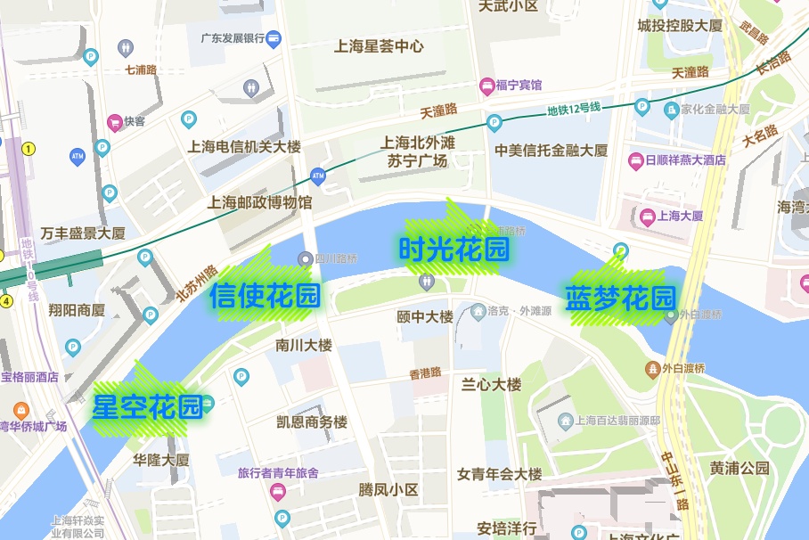 从上海大厦的蓝梦花园伊始,经由宝丽嘉酒店的时光花园、邮政博物馆的信使花园,终至河滨大楼的星空花园,以建筑为载体、以步道为串联,形成林为调、花为媒的客厅花园,着力打造一个融合地域特色与苏河文化的景观空间,让“文化”与“树林”和“花园”融为不同的花园故事。