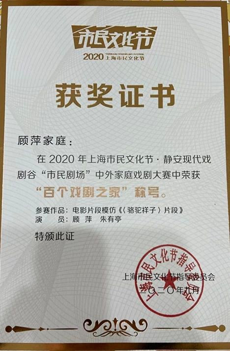 近日,上海知名主持人骆新,以及2020年“中外家庭戏剧大赛”剧组,来到嘉定新城(马陆镇)拜访顾萍夫妇,邀请他们俩再次参加活动。此前,顾萍夫妇在2020年上海市民文化节之静安现代戏剧谷“市民剧场”中外家庭戏剧大赛中演绎《骆驼祥子》片段,荣获了“十大人气家庭”称号以及“百个戏剧之家”称号。
