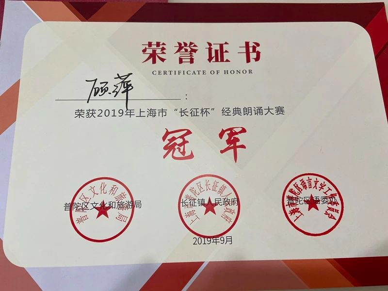 她是一位朗诵者。顾萍说朗诵是把文字转化为有声语言的一种创造性活动,喜欢铿锵有力或婉转悠扬地朗诵经典读物。从2018年开始,顾萍缩减了外出采风的时间,将更多精力放在了朗诵上。她连续两年报名参加了上海市“长征杯”经典朗诵大赛。第一次参赛获得季军,第二次参赛获得冠军。
