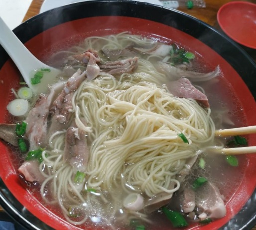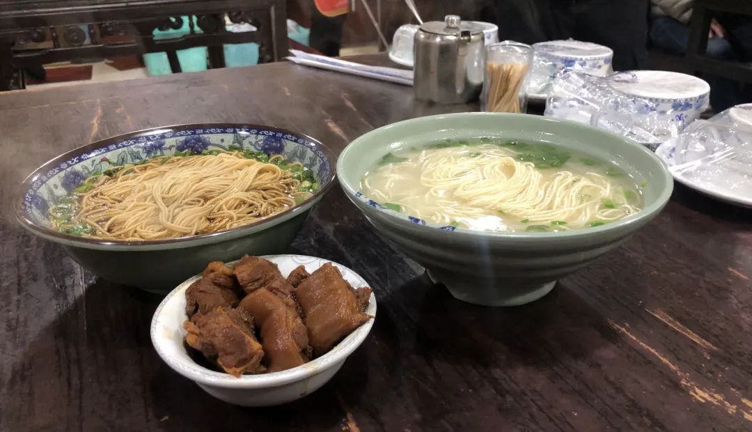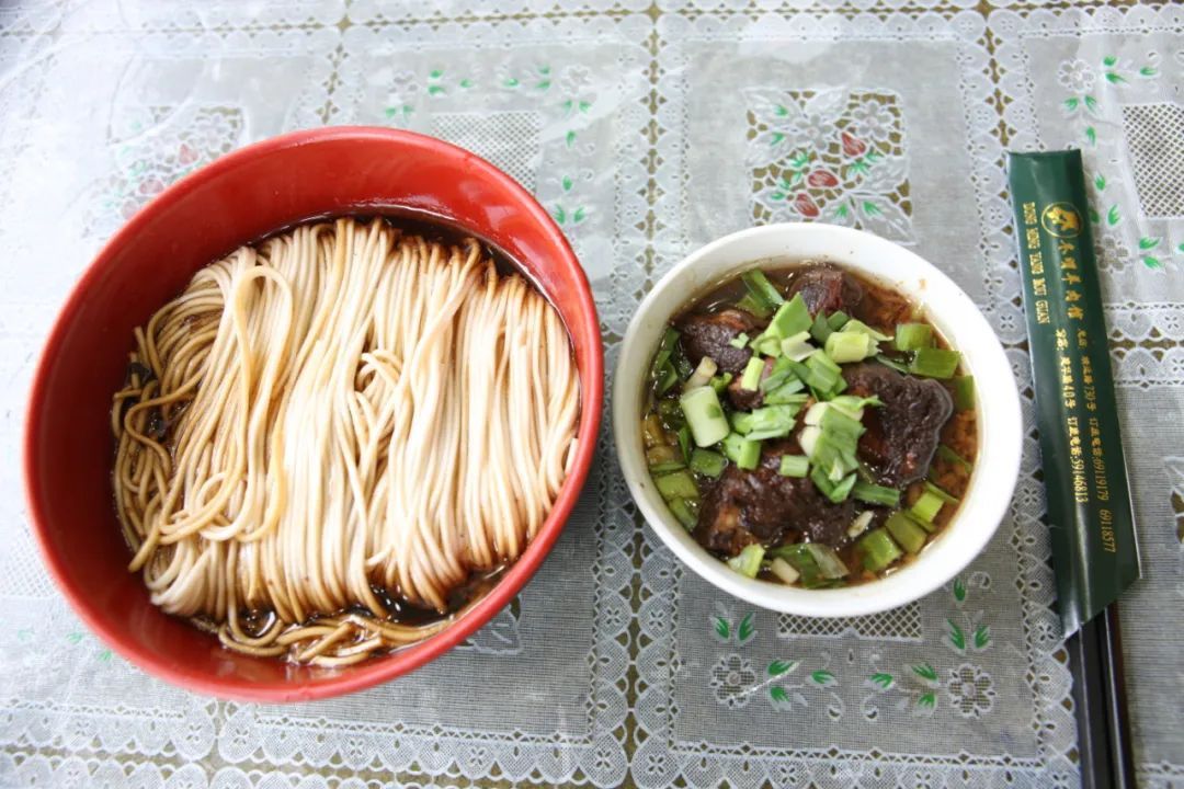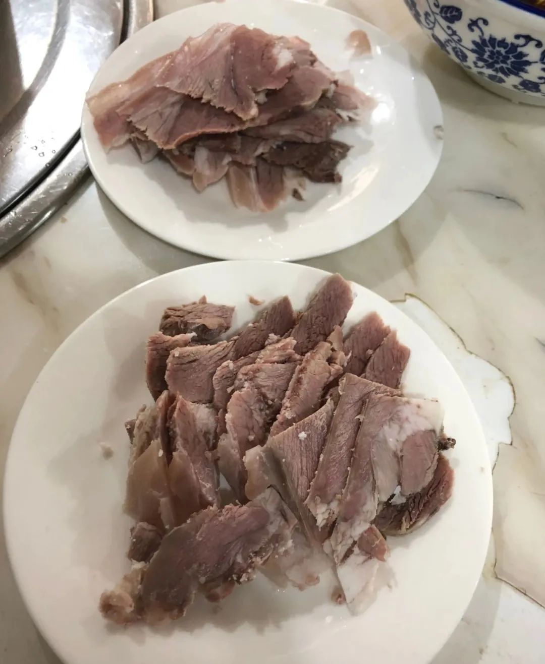 羊肉面有红烧和白切羊肉两种,前者汤水浓郁,羊肉软糯不膻气,入口有甜甜的味道;后者羊肉被切成薄片摆盘,辅以一叠酱油,肉质鲜嫩,最佳吃法是一片羊肉一口素面,肉尽面光恰到好处。