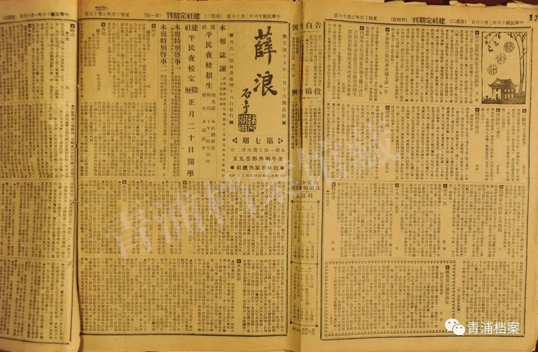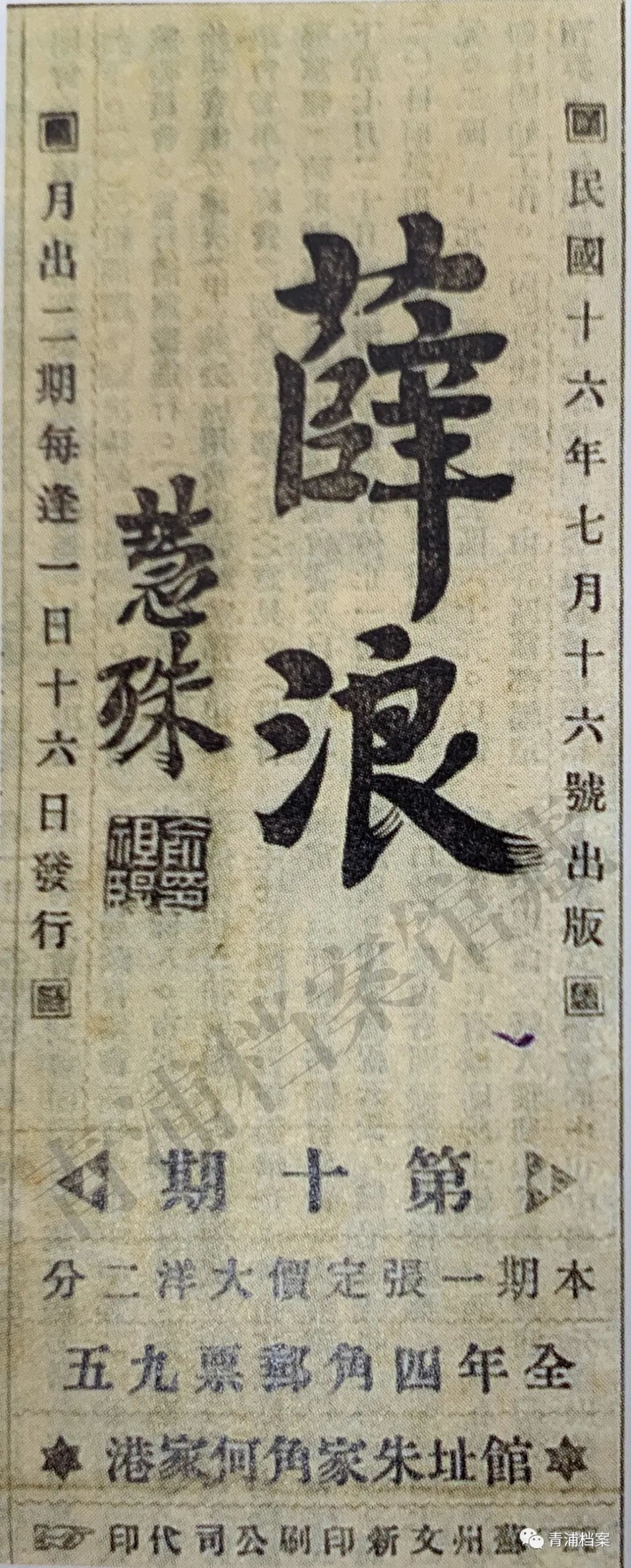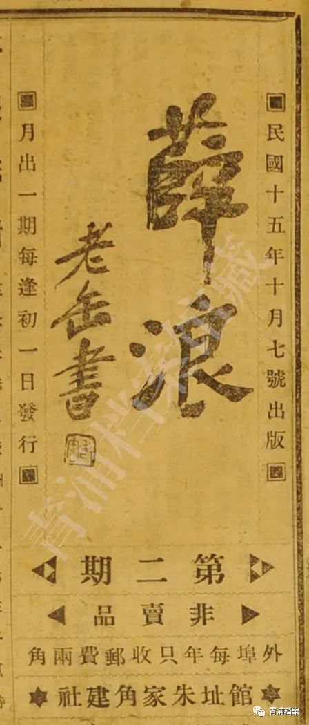 《薛浪》是由新南社社员、柳亚子堂弟柳率初与李鼎三、李惠民在1926年9月于朱家角镇创办的,报纸及时报道时政新闻,紧密关注当时政治、经济、文化各个方面的信息,并开辟《浪浪》为文学诗歌专栏。而标志着该报浓重文化气息的首当其冲就是其报头题字。《薛浪》报共20期,从创刊号、第二、三、四、八期,所用报名为吴昌硕所题,落款为“老缶书”,钤有篆书“老缶”阳文印。吴昌硕,别号老缶、缶庐、苦铁等,晚清民国时期著名书画家、金石篆刻家,“诗、书、画、印”四绝,与任伯年、赵之谦、虚谷齐名为“清末海派四大家” ,对后来书、画、印学影响极大。当时吴昌硕已是年逾八十的耄耋老人,但是寥寥“薛浪”两字,虽非他著名的篆书,仍是苍拙雄宏,笔厚墨重,透出幽奥的金石之气。