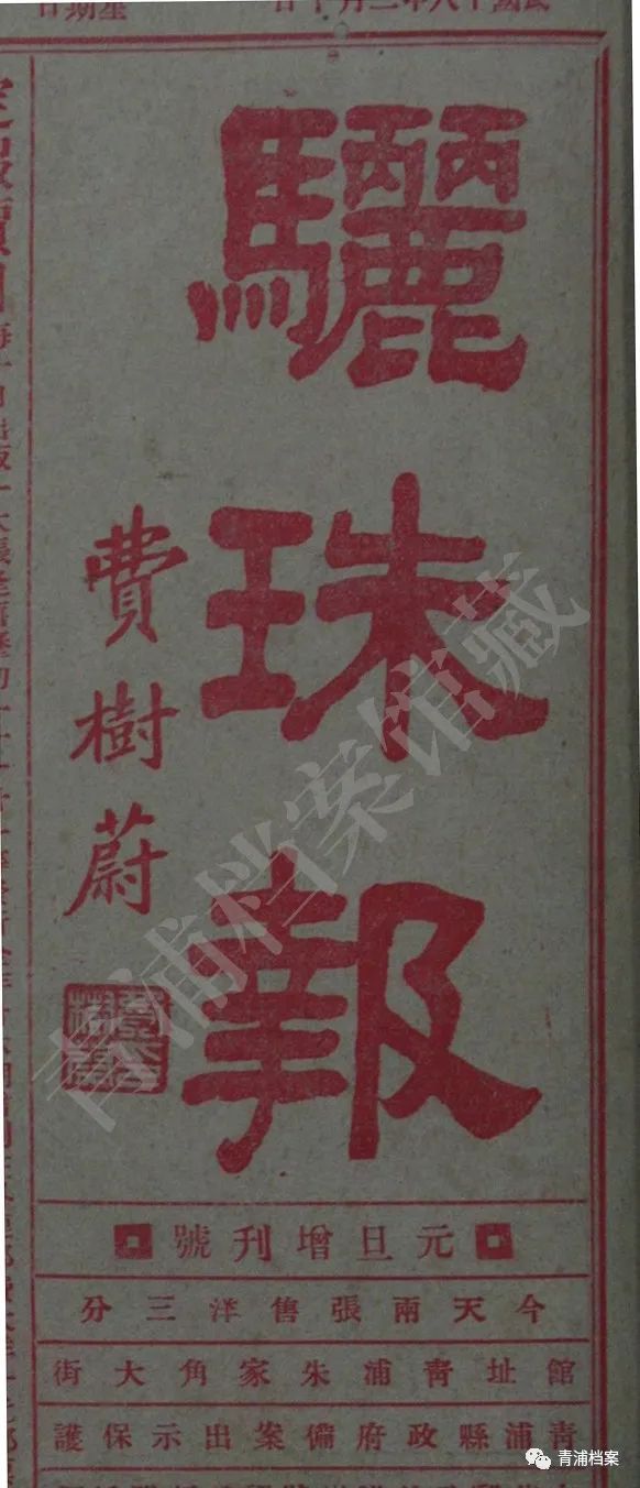 在馆藏的几十种报纸,其各个报头不乏近代许多名人的题写,难能可贵的是很多名人题字留有落款、钤有印章,让后人在重读当年报纸时,欣赏到诸多名家的墨迹。青浦老报纸的报头题名既有当时的文化名人,也有当时的政治红人。除去没有署名,现在暂时不做考证的外,现存青浦老报纸上有署名的名人题字共有十多种,有的报纸的报名题字不固定,不同阶段用不同名人的题字,比如《薛浪报》《骊珠报》等先后用过好几位名人的题字。青浦许多报人本来就是文化人,与沪上很多文化名人有着往来唱和,沪上著名书画家是他们首先邀请的对象。