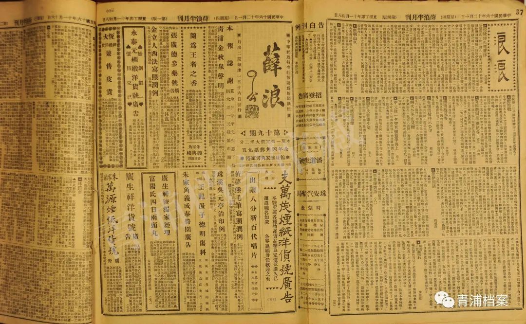 第三个为《薛浪》题报头是俞祖望。俞祖望,一字慧殊,青浦人,与表兄沈瘦东一起师从叶袖东(《青浦报》的创刊人之一),后又师从山阴任堇叔,也是南社诗人。他深谙政法,曾在江南多地开律师事务所, 1936年,在上海发生了震惊中外的“七君子事件”,俞祖望仗义执言,出庭为“七君子”辩护,责问当局“爱国何罪?”