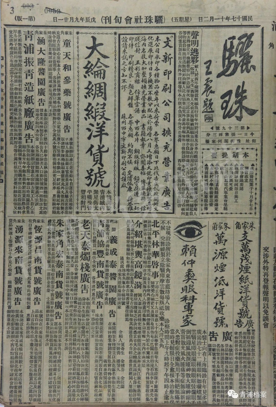 由清末名医陈莲舫之孙陈范我创办于朱家角的《骊珠》报,其题头也出自海上名人的笔墨。其中四十七期之前皆由王震题写。王震乃清末民初海派代表性画家,字一亭,号白龙山人,浙江省吴兴人,生于上海。早年学习任伯年画法,中年后拜吴昌硕为师,曾参与发起豫园书画善会。好佛,曾任中国佛教会会长。晚年曾为全国艺术家协会理事。著作有《白龙山人诗稿》等。他所提的行草“骊珠”二字如行云流水般潇洒俊逸,钤有隶书“一亭”阳文印。