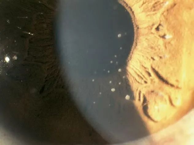角膜后下方见数枚羊脂状沉着物