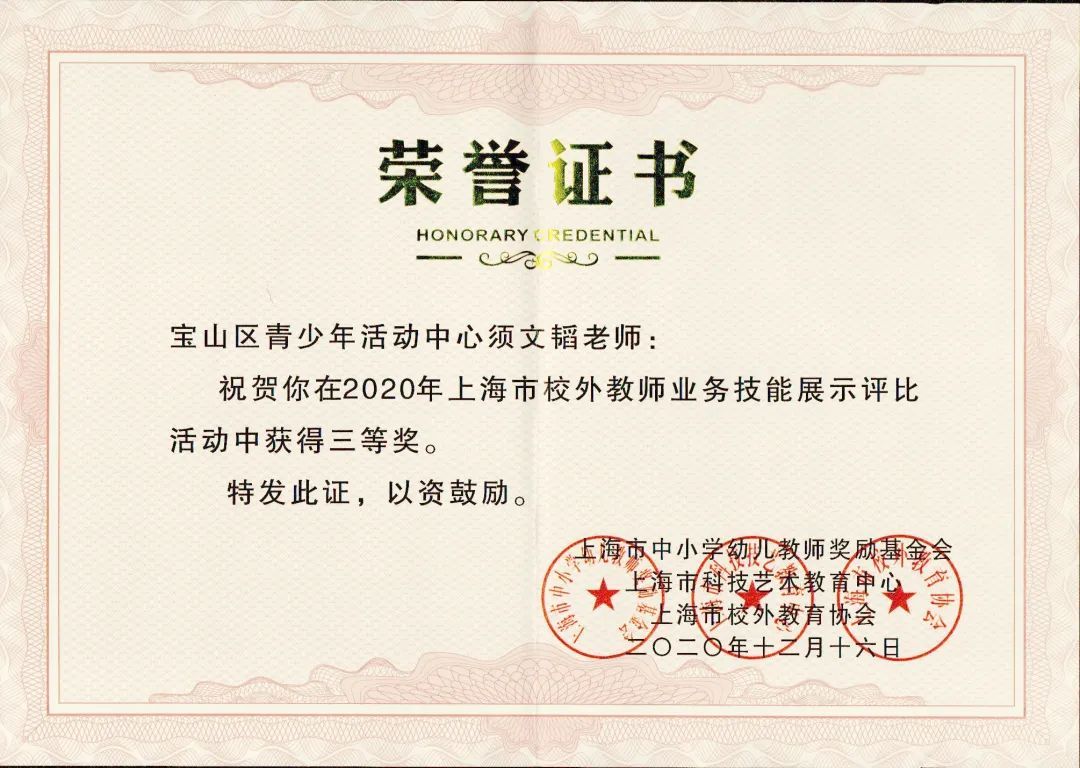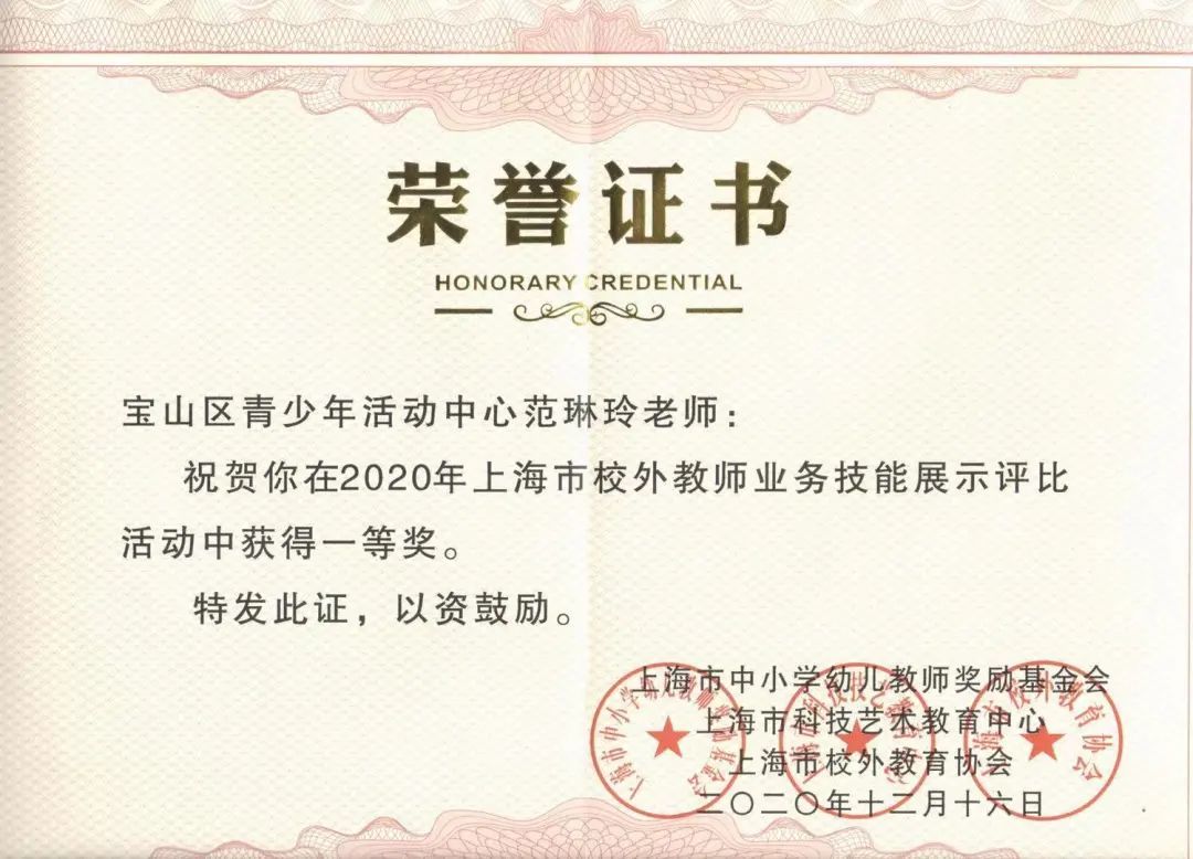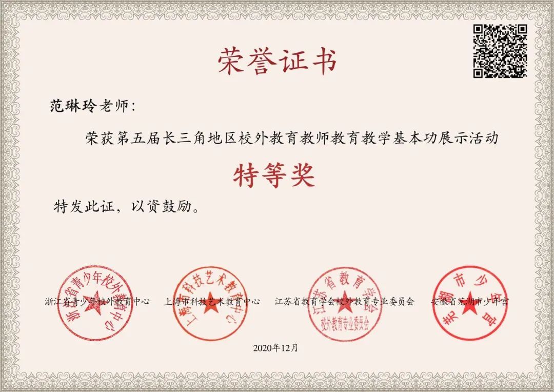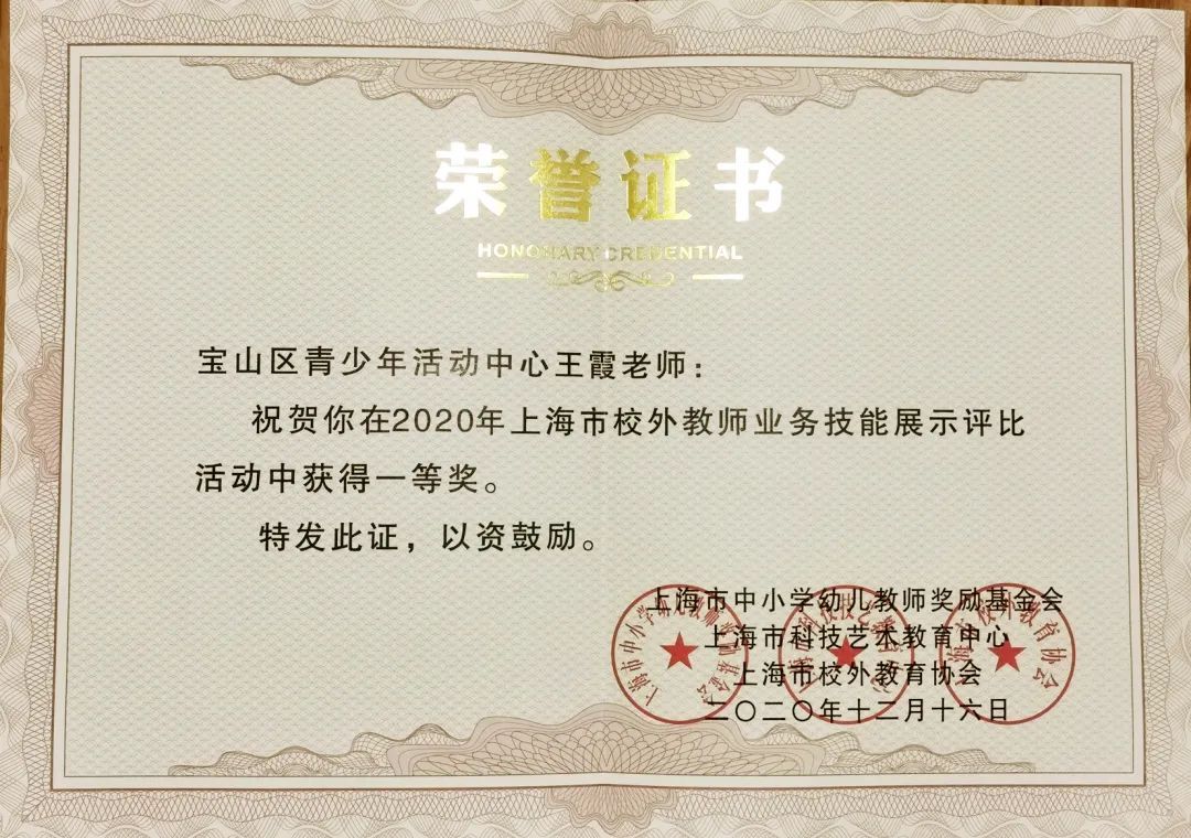继11月24日宝山区青少年活动中心王霞、范琳玲、须文韬三位教师在2020年上海市课外校外教师专业发展展示评比活动中荣获2项一等奖(全市一等奖共计11项)和1项三等奖之后,在日前结束的第五届长三角地区校外教育教师教学基本功展示活动中,范琳玲老师又喜获特等奖。