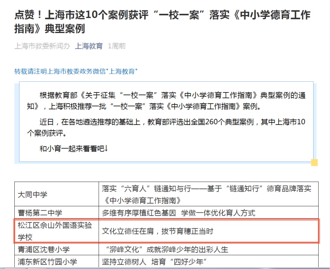 根据教育部《关于征集“一校一案”落实典型案例的通知》,松江区积极推荐“一校一案” 落实《中小学德育工作指南》案例,在教育部评选出全国260个典型案例中,上海共有10个案例获评,其中上海市松江区佘山外国语实验学校《文化立德任在肩,拔节孕穗正当时》案例获评。