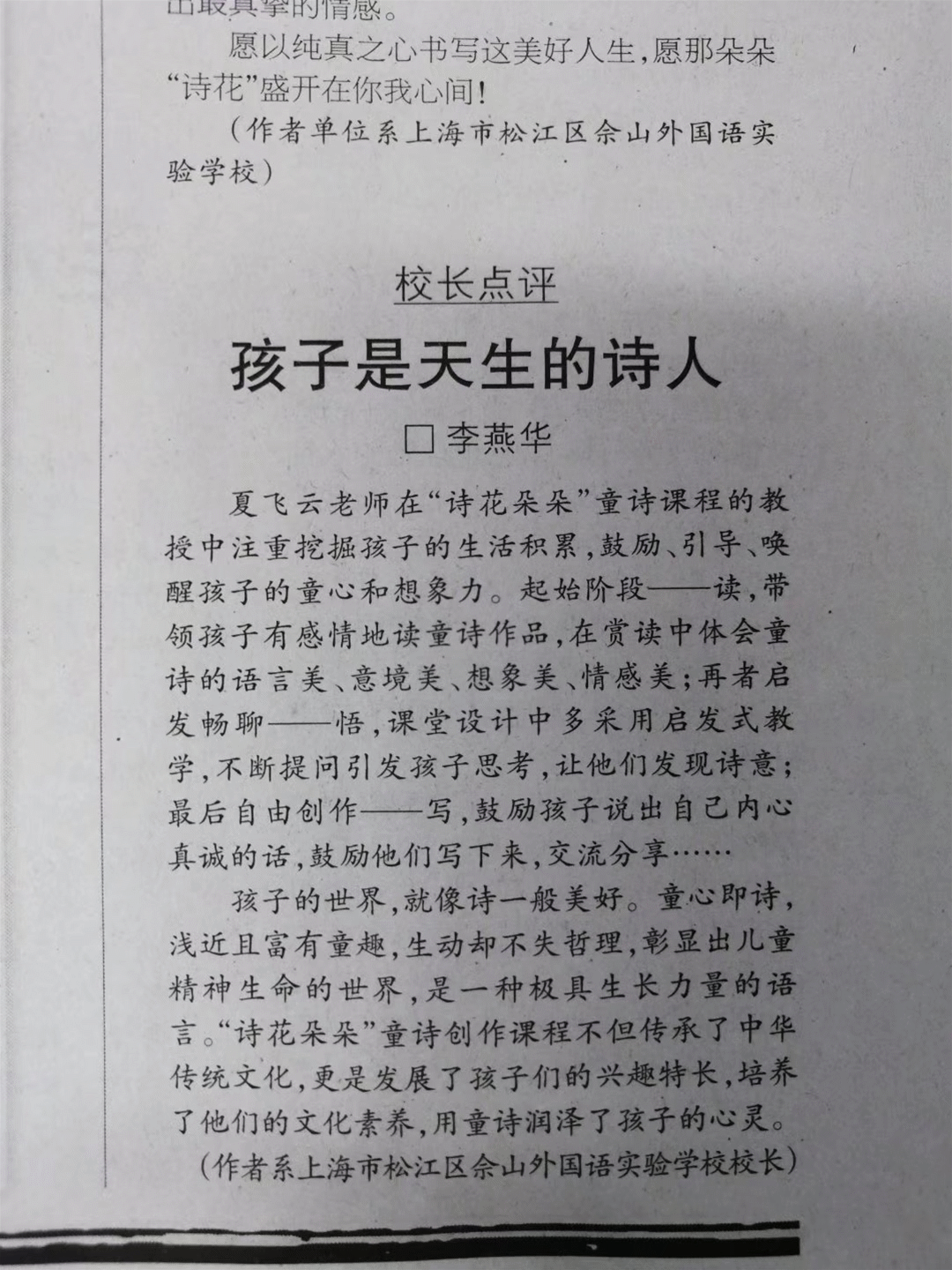 2020年7月25日,《语言文字周报·教育周刊》整版报道我校书香课程《厚植文化根脉,坚定文化自信——依托课程建设打造“书·声”语言文字工作品牌》。“诗花朵朵”童诗社团是“书·声”五艺课程中关于“写”的品牌,社团创办以来,作品已汇编成《童年与诗相遇》校本作品集(第一辑)。姚舒梦同学多个作品在公众号和杂志《诗锚》上发表,参与录制的《正能量》诗歌在电视台播出,反响良好。陈韵安同学在报刊和网络平台发表作品三十多首,获得第二届“长嘉”全国少儿诗歌大赛三等奖。夏飞云老师的文章《朵朵“诗花”喜盛开》在《中国教师报》第775期发表。2020年10月,学校面向全区,开展了“书·声”五艺书香阅读课程展示活动。
