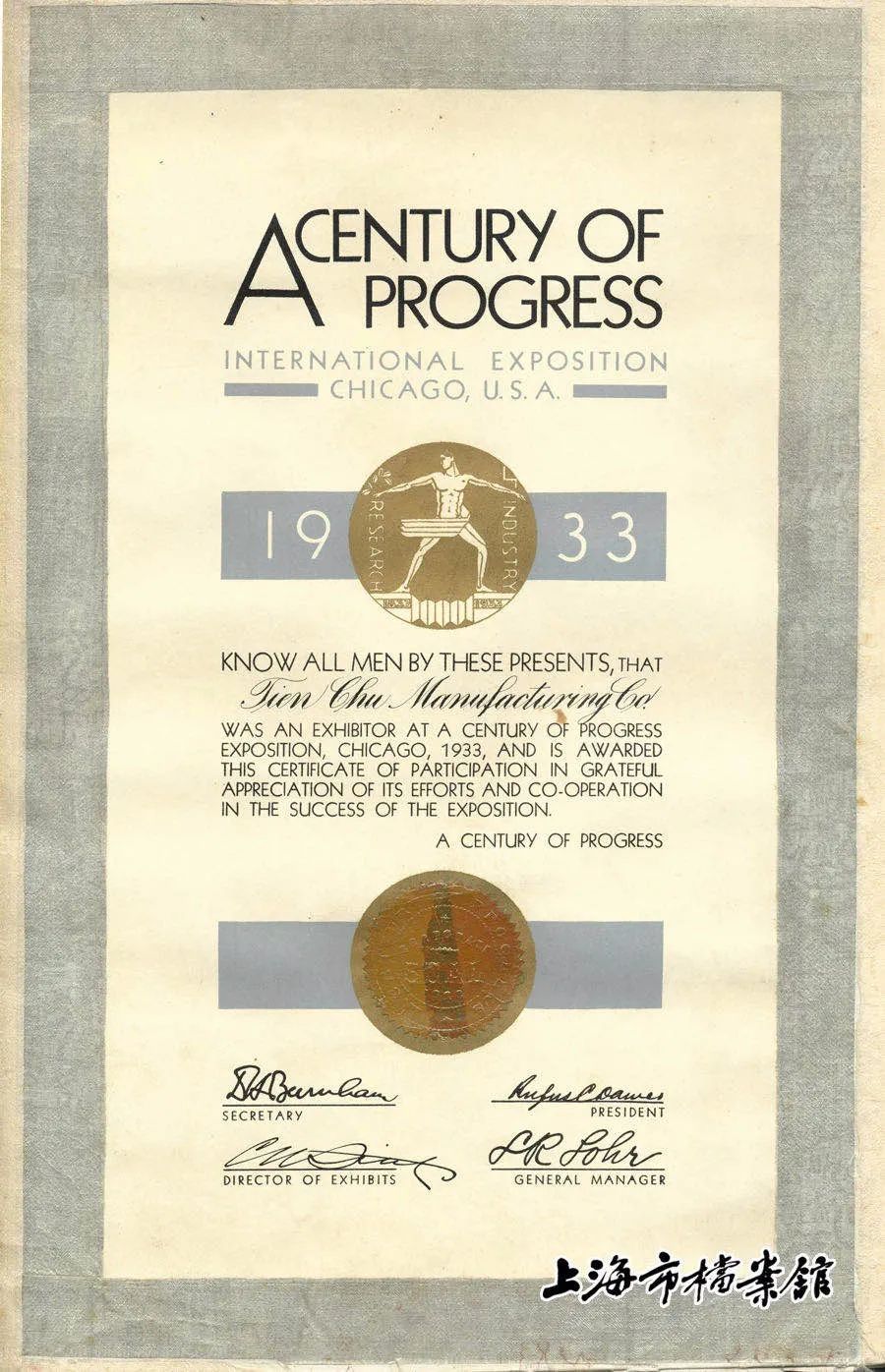 1933年,天厨味精厂参加美国芝加哥世博会的参展证书(上海市档案馆藏)