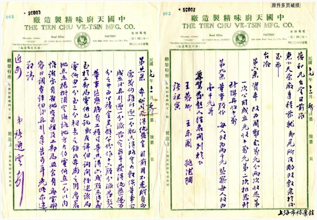 吴蕴初为天厨厂业务问题致张逸云的文件(上海市档案馆藏)