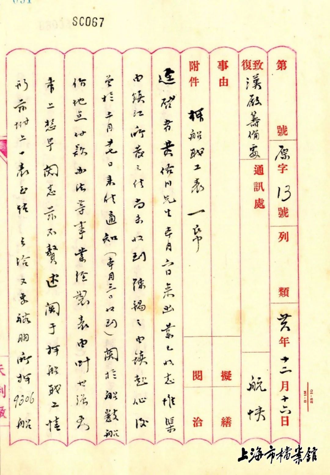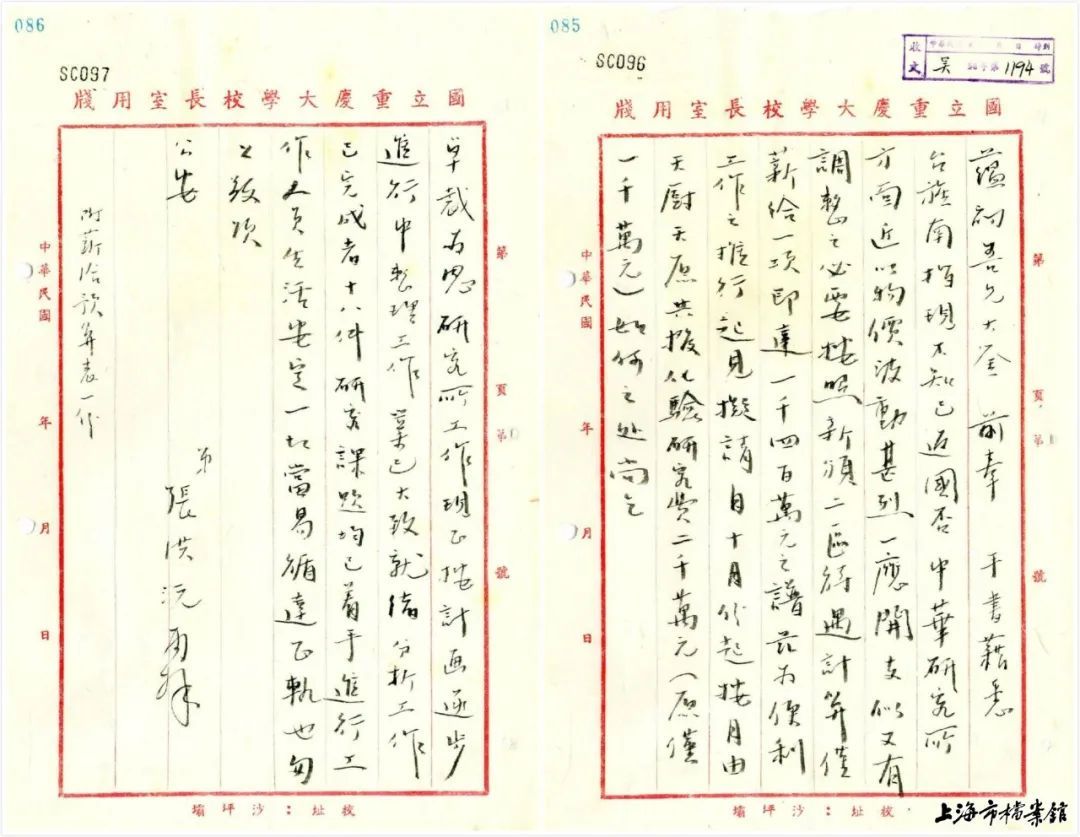 重庆大学校长张洪沅关于中华工业化学研究所研究经费一事致吴蕴初的文件(上海市档案馆藏)