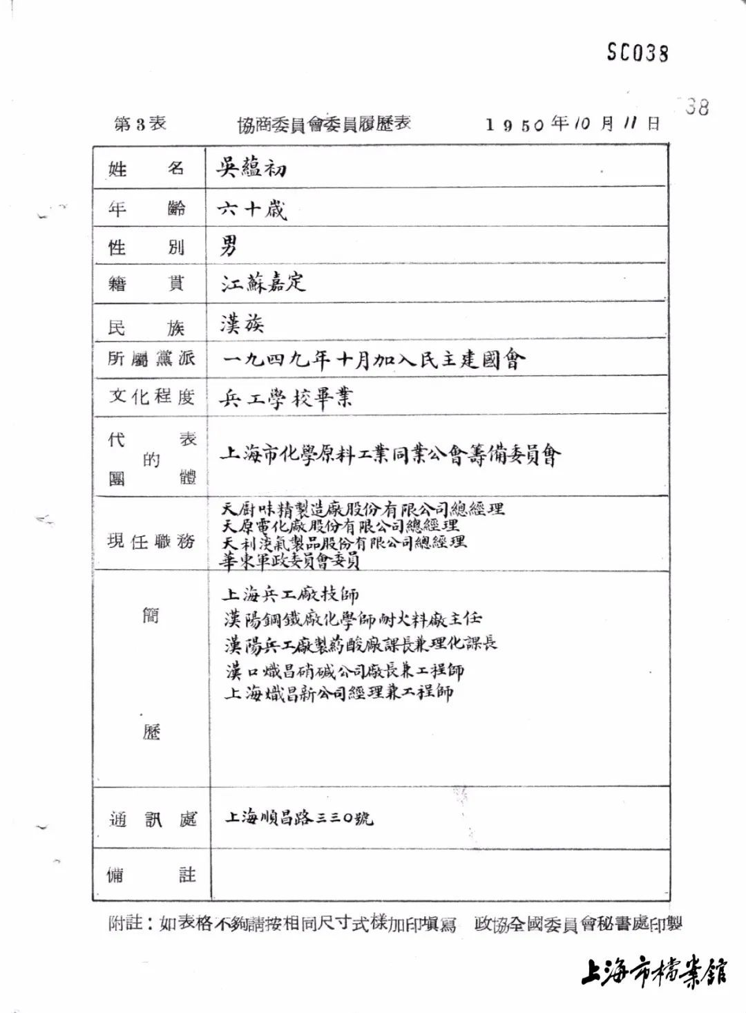 1950年,吴蕴初参加上海市第二届第一次各界人民代表会议的代表履历表(上海市档案馆藏)