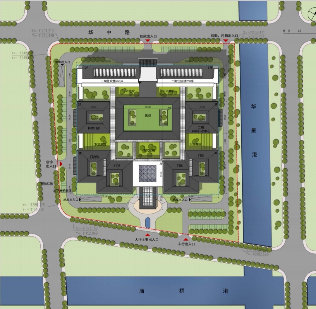 根据规划,闵行区中医医院将以医技为中心,南面门诊,北面住院,行政科研临河景观优美,各功能单元通过庭院串联,人车分流、洁污分流,车行外环,人走内环,并将河流景观渗透入建筑内部。