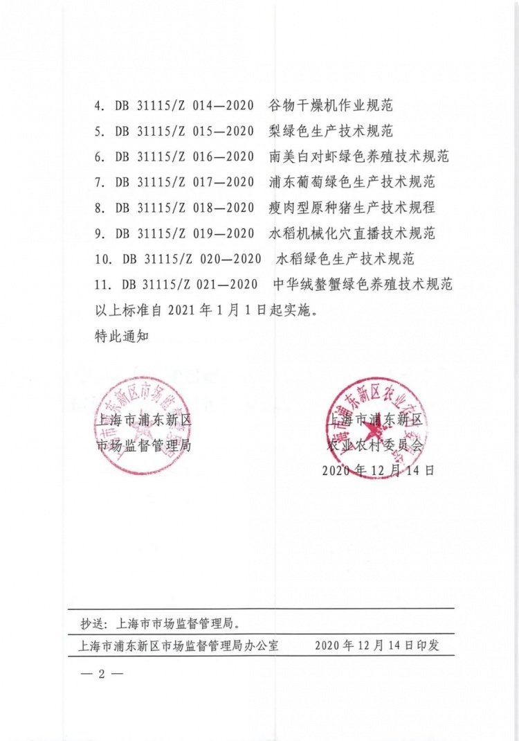 据悉,以上标准将自2021年1月1日起,在浦东新区的“南汇8424”西瓜、南汇水蜜桃、浦东葡萄、水稻、南美白对虾、中华绒螯蟹、梨、扁豆、瘦肉型种猪、谷物烘干机、水稻机械化穴直播等11个品类的绿色生产过程中,予以推荐实施。