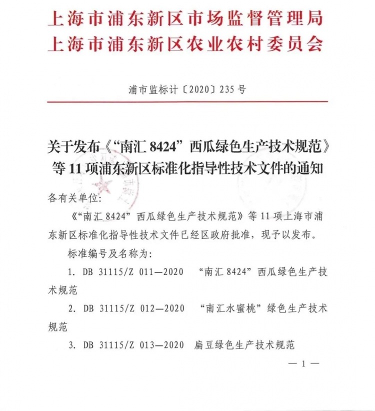 随着浦东新区农业标准化文件实现零突破,上海市区级农业行业标准的空白,近日得以填补。日前,浦东新区市场监督管理局与浦东新区农业农村委员会联合发布《“南汇8424”西瓜绿色生产技术规范等11项浦东新区标准化指导性技术文件的通知》(浦市监标计〔2020〕235号)文件。