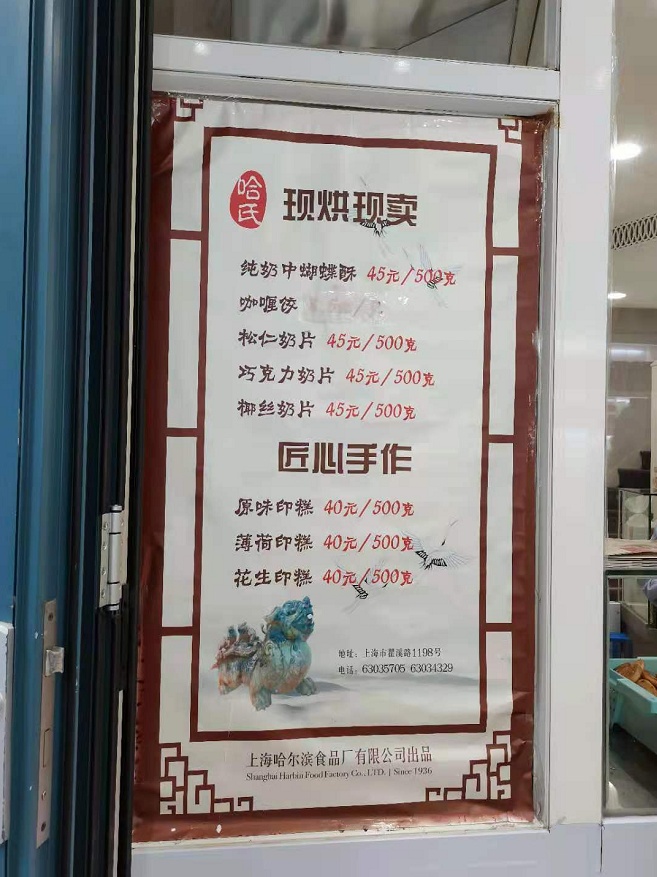 在店门口张贴的海报上,写着哈氏各款现烘现卖的点心和匠心手作。