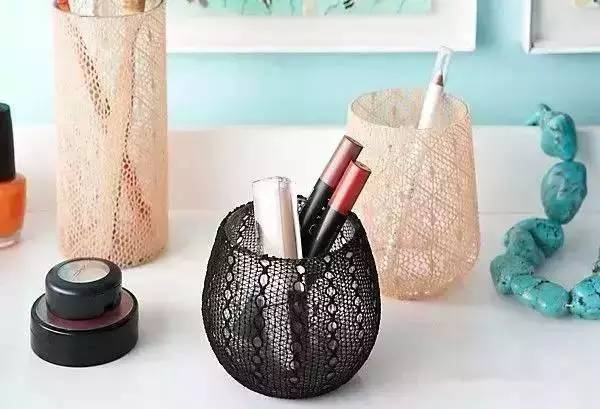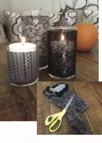 将丝袜剪开,套在玻璃瓶外面,就给玻璃瓶加了一层装饰,点上蜡烛,平添几分情调!