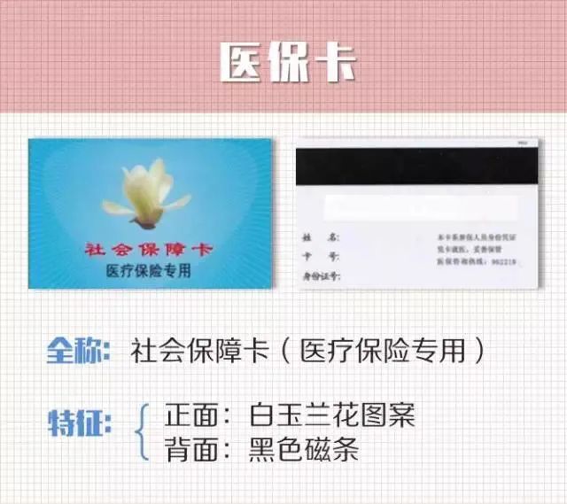 【医保卡】上有“社会保障卡(医疗保险专用)”字样,有白玉兰花图案,有黑色磁条,没有个人照片。热线电话是962218。