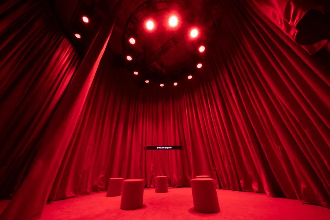 同样由铆钉元素所构成的粉色与“尖刺形”铆钉形成独特反差魅力,它被设计成一个“消音室”,三角锥形的铆钉实则为金字塔形的吸音材料,墙壁上的投影文字也无时无刻刺激着人们的无限遐想。
