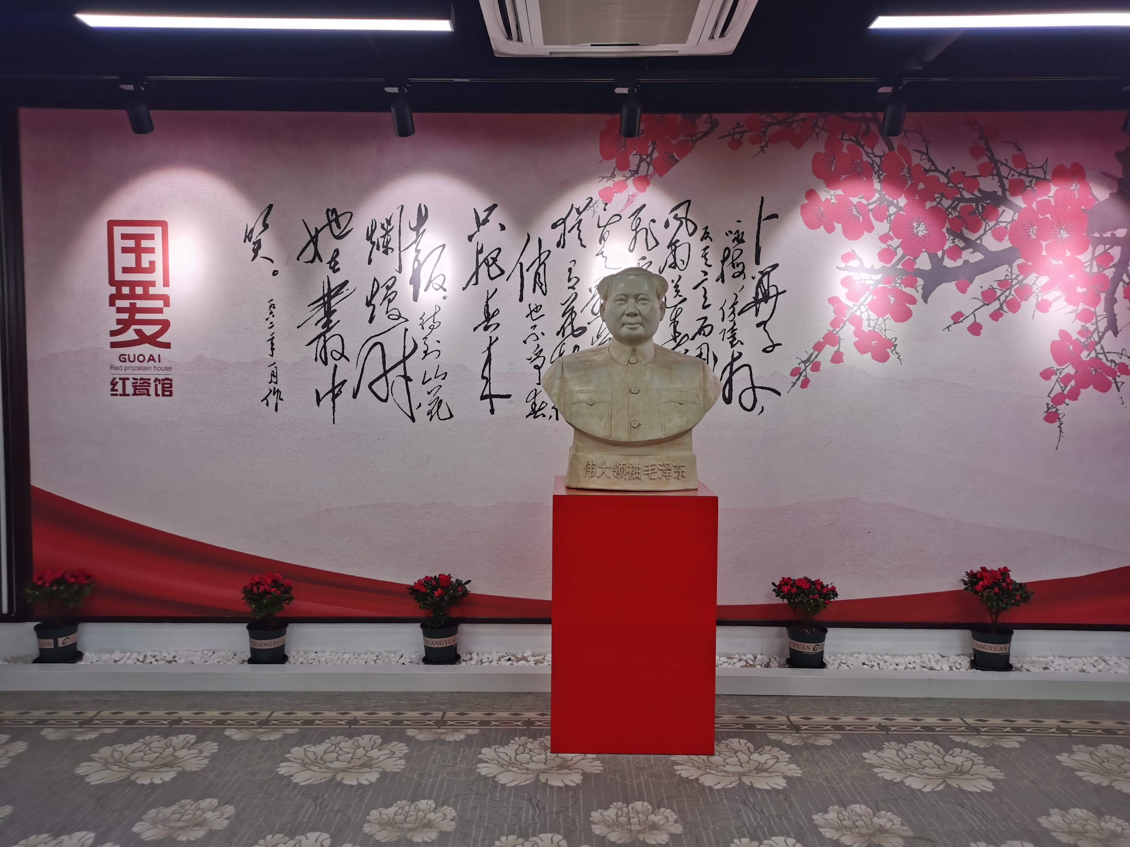 进入红瓷馆,首先映入眼帘的“镇馆之宝”——毛泽东主席素胎瓷大型胸像,这尊胸像由景德镇陶瓷研究所于1967年生产,体现了毛主席作为伟大领袖、伟大统帅、伟大导师、伟大舵手的高大形象。