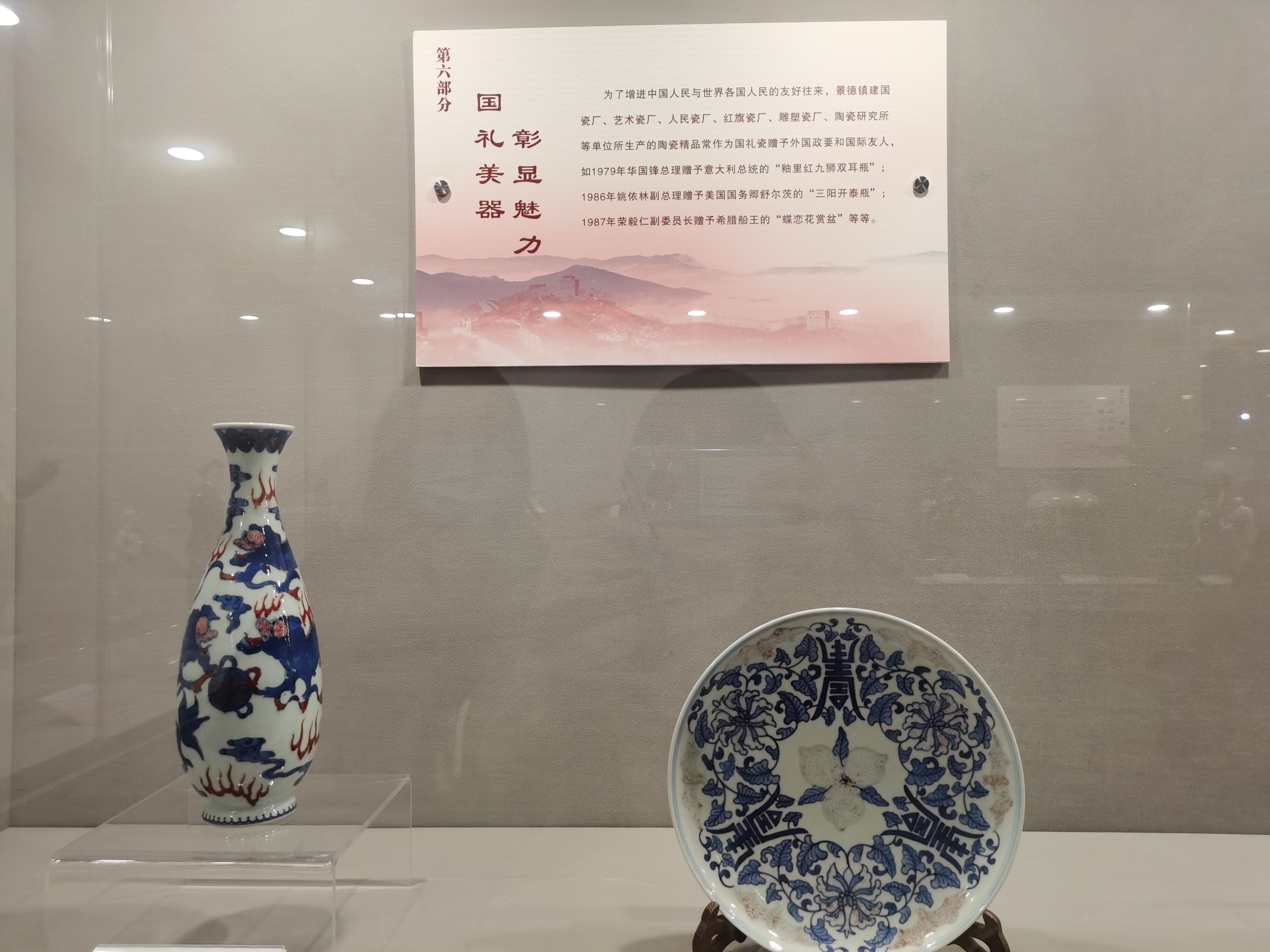 据介绍,展品基本为新中国成立后至上世纪80年代期间江西景德镇生产的红色瓷器。“千年瓷都”景德镇是“红色瓷文化”重镇,新中国成立后,景德镇相继整合组建了一批大型国营瓷厂,这些瓷厂被人们称之为“十大瓷厂”。“十大瓷厂”除了生产民用瓷外,还为中央和国家机关承担生产了大量的生活用瓷、陈设用瓷、国家礼品用瓷。因而,“十大瓷厂”在民间又被称作当代“红色官窑”,其出产的瓷器也成为弘扬红色文化、传承红色基因的载体。