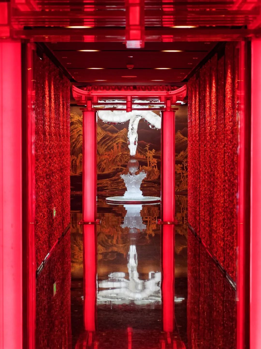 来到103层“锦筵”中式餐厅,举目所及都是一片喜庆的“中国红”,走廊尽头摆放着一条晶莹剔透、“从天而降”的琉璃祥龙。