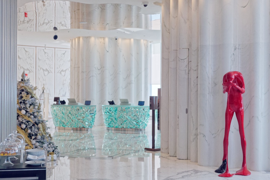 乘坐高速电梯,就可以直达世界最高的101层酒店大堂,一场视觉和艺术的云端之旅由此开始。错落排列的立体水晶接待台侧面,是由法国艺术家用金属丝手工精心编制的芭蕾舞者,在天幕下仿佛云中仙女,迎接客人到来。据悉,J酒店内陈设的1000多件艺术品均出自国内外知名艺术家之手。