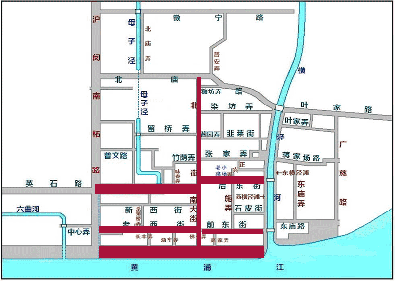 张老先生画的老闵行七条主要商业街为后东街、前东街、新安路和新街、老西街、北街、南大街和外滩。另外,他还补充了施弄,东、西横泾滩和老小菜场的商店。
