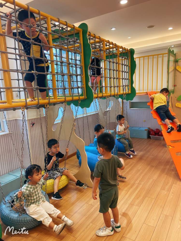 比如,今年开学时,就在小班部的80平米大礼堂添置了室内操控性运动设备,包括传统钻爬跑跳区域和滑梯运动区域,囊括了孩子的上肢锻炼,下肢锻炼,平衡性锻炼,感统训练。而中大班部的教室、走廊、楼梯角落等各个地方,都有各种攀岩、绳梯、吊环、树屋、滑梯等体锻装置。