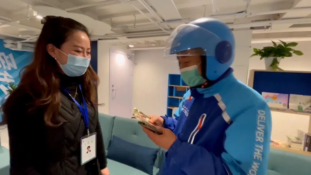 订单响个不停,送餐员小葛的脚步也奔波不停。中午时分,小葛趁着订单的间隙短暂下线以解“燃眉之急”。在近铁广场南座的近铁e站里,来自属地长风新村街道的党建指导员见缝拆针为他递上了热茶和暖宝宝。短暂休息之后,小葛又开始了送餐之路。