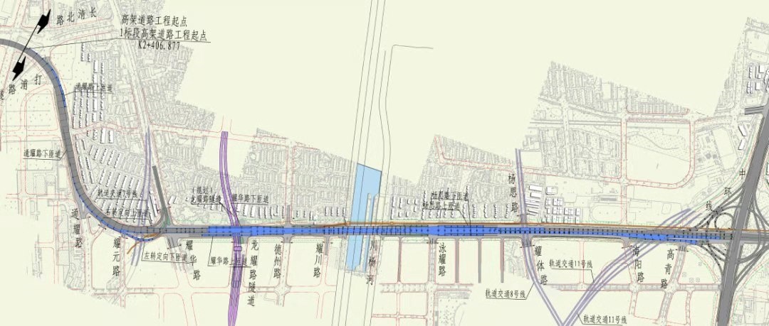济阳路快速化改建工程卢浦大桥至中环立交段高架全长3.89公里,采用“高架快速路+地面辅路”的断面布置形式,高架主线设置双向6车道,在耀华路和杨思路各设置一对匝道,在通耀路卢浦大桥东侧设置一根上匝道。