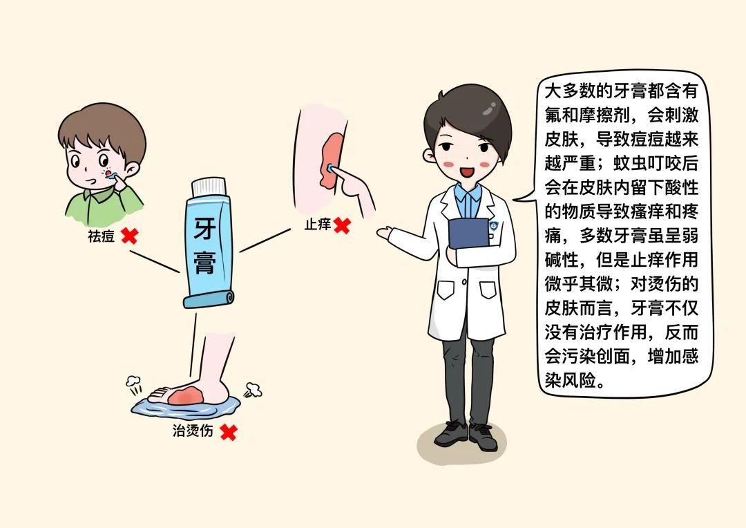 牙膏的成分是针对口腔清洁、维护口腔健康而设计的,靠牙膏治痘痘是无用的。大多数牙膏都含有氟和摩擦剂,反而会刺激皮肤,导致痘痘越来越严重。如果是蚊虫叮咬,会在皮肤内留下酸性的物质导致瘙痒和疼痛,多数牙膏虽然呈弱碱性,但其止痒作用微乎其微。对烫伤的皮肤而言,牙膏不仅没有治疗作用,反而会污染创面,增加感染风险,应及时自来水下冲淋,在医生指导下用药。