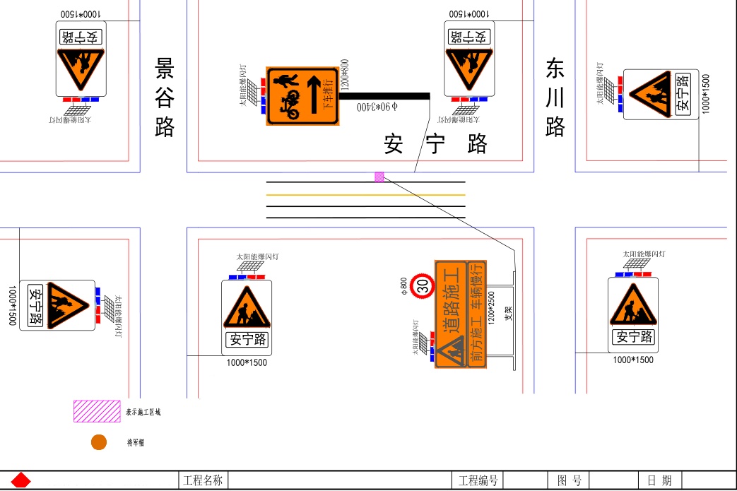➊ 安宁路段(景谷路至东川路)道路施工人行道、非机动车道、机动车道。