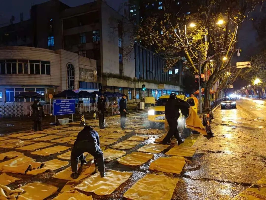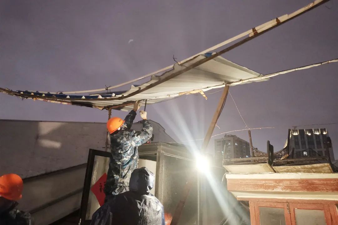 永善公司迅速排除瑞金二路225弄32号私搭高坠及多处雨棚脱落险情,协助街道在瑞金医院出入口铺设麻袋200只。