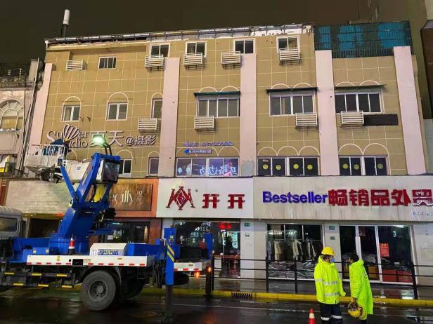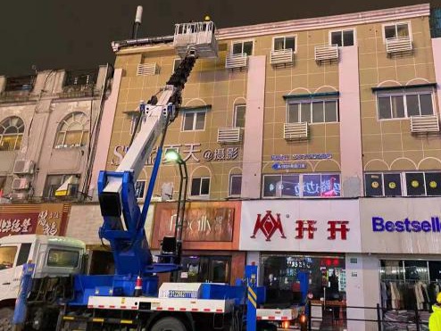 物业调集了登高作业车和排险人员对该危险点进行了排险作业,至晚22时终于将该房屋的危险排除,确保了居民的生活安全与行人的出行安全。