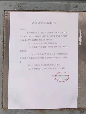 四平物业、杨房物业等按照集团统一部署,第一时间召开紧急会议,启动防冻保暖应急预案,组织24小时人员值班,张贴告示提醒居民,为垃圾分类投放点旁的便民洗手桶灌上热水、“穿上”棉袄,方便居民生活。
